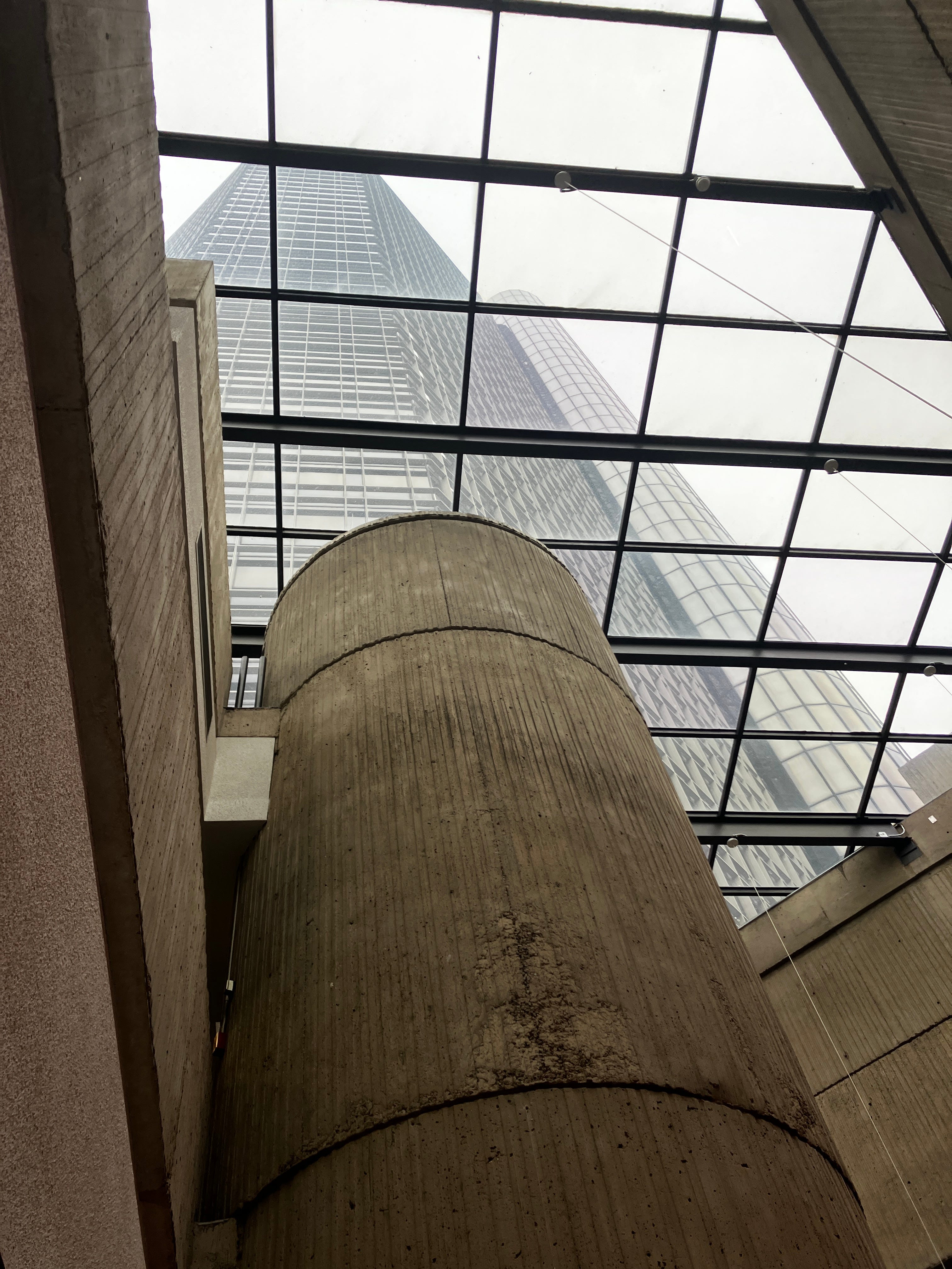 Inside the door, I looked up to see one of the trademarks of the RenCen: concrete. It is clearly a building that has seen better days, and concrete, as anyone familiar with construction knows, does not stay pristine for long. It absorbs dirt, odors and has to be cleaned regularly, a significant task in a skyscraper that is full of pillars.